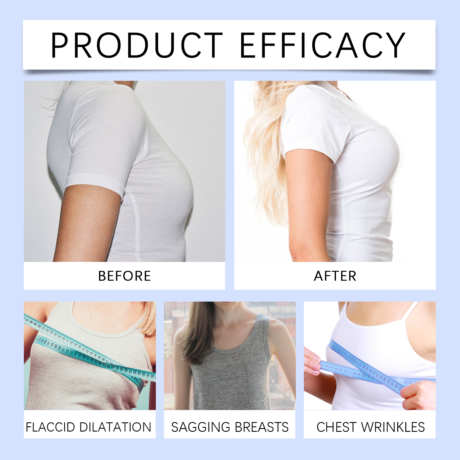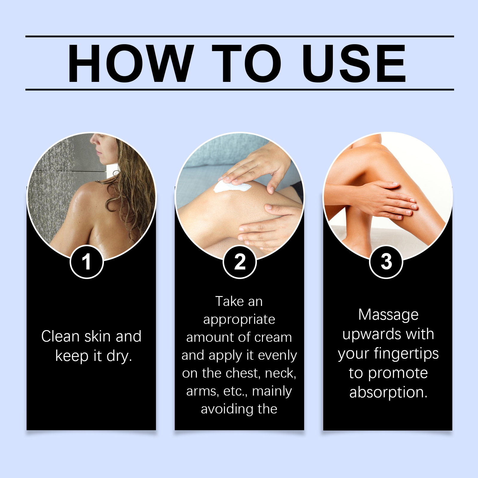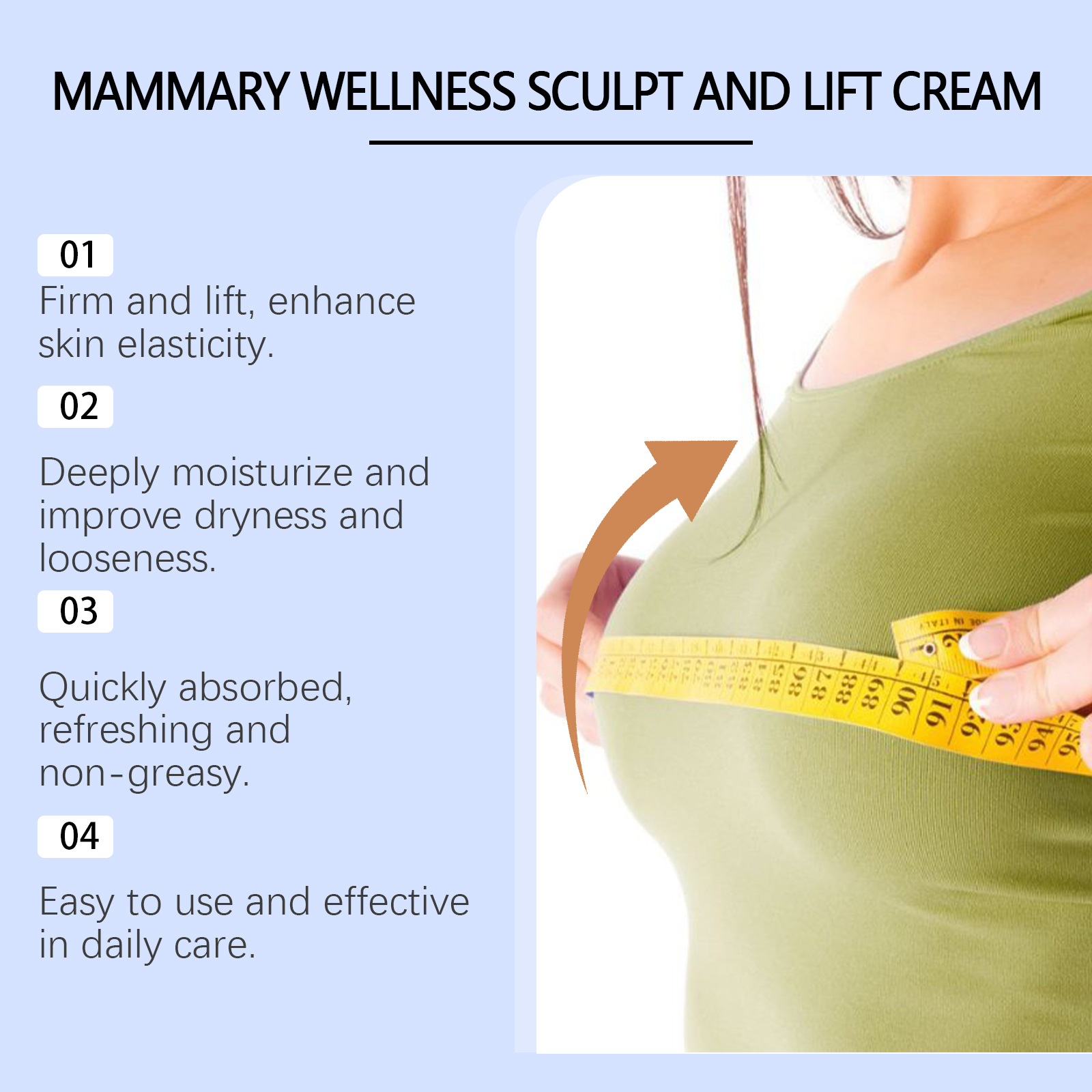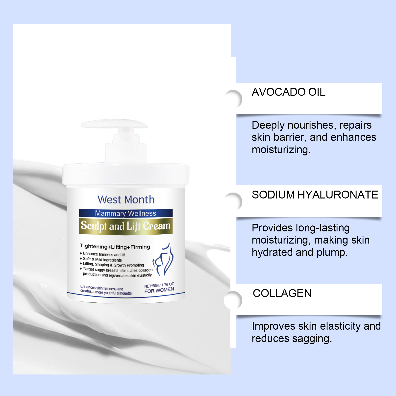 Our breast cream contains Jojoba seed oil, avocado oil, and sodium hyaluronate. It can deeply nourish, repair skin barrier, enhance moisture; Provides long-lasting moisture and leaves skin hydrated and plump. Improves skin elasticity and reduces skin sagging. Its application method is simple: 1. Clean the skin and keep it dry. 2. Apply an appropriate amount of the cream evenly to the chest, neck, arms and other areas, avoiding the nipples as much as possible; 3. Massage upward with your fingertips to promote absorption. Rich oil ingredients moisturize the skin, improve dryness and flabby skin.